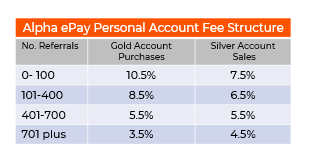 Transaction Fees: As displayed are reduced based on the number of referrals who join the Alpha eMarkets and Alpha ePay as a result of individuals referral efforts using Alpha Shopping Vouchers or their Referral Link or Referral Code as a method to track their referral efforts.